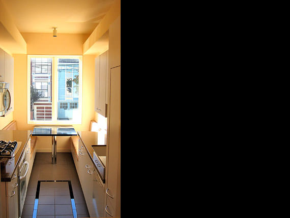 Project Goals: Update 7'-4" wide kitchen and bath, providing banquette seating in kitchen, and full-size shower in 32 SF bath