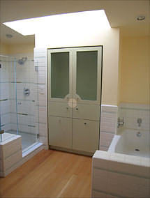 Project Goals: Provide vanity; increase linen storage; expand shower with bench; incorporate room air supply in tub location